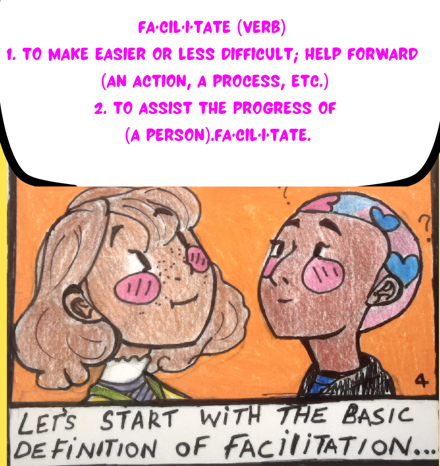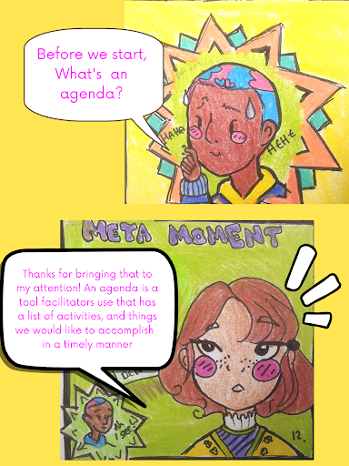 Hiya! I’m glad you’re expressing interest in facilitation! These skills will help you all throughout life! This comic was created by VOX ATL teen editor Zariyah Allen whose role is facilitation liaison and publishing meeting leader! Zariyah has a passion for both art and facilitation, this comic was created in hopes to bring the big skills of facilitation to you in an artistic way! The purpose of this comic is to teach you step-by-step alongside our characters, from a beginner’s level. A Lot of us are visual learners and Zariyah thought “what better than to learn a new skill through a story comic!” So with all that being said let’s get started learning the skills! Be sure to stay tuned for each episode of… “Facilitation 101 comic style!”