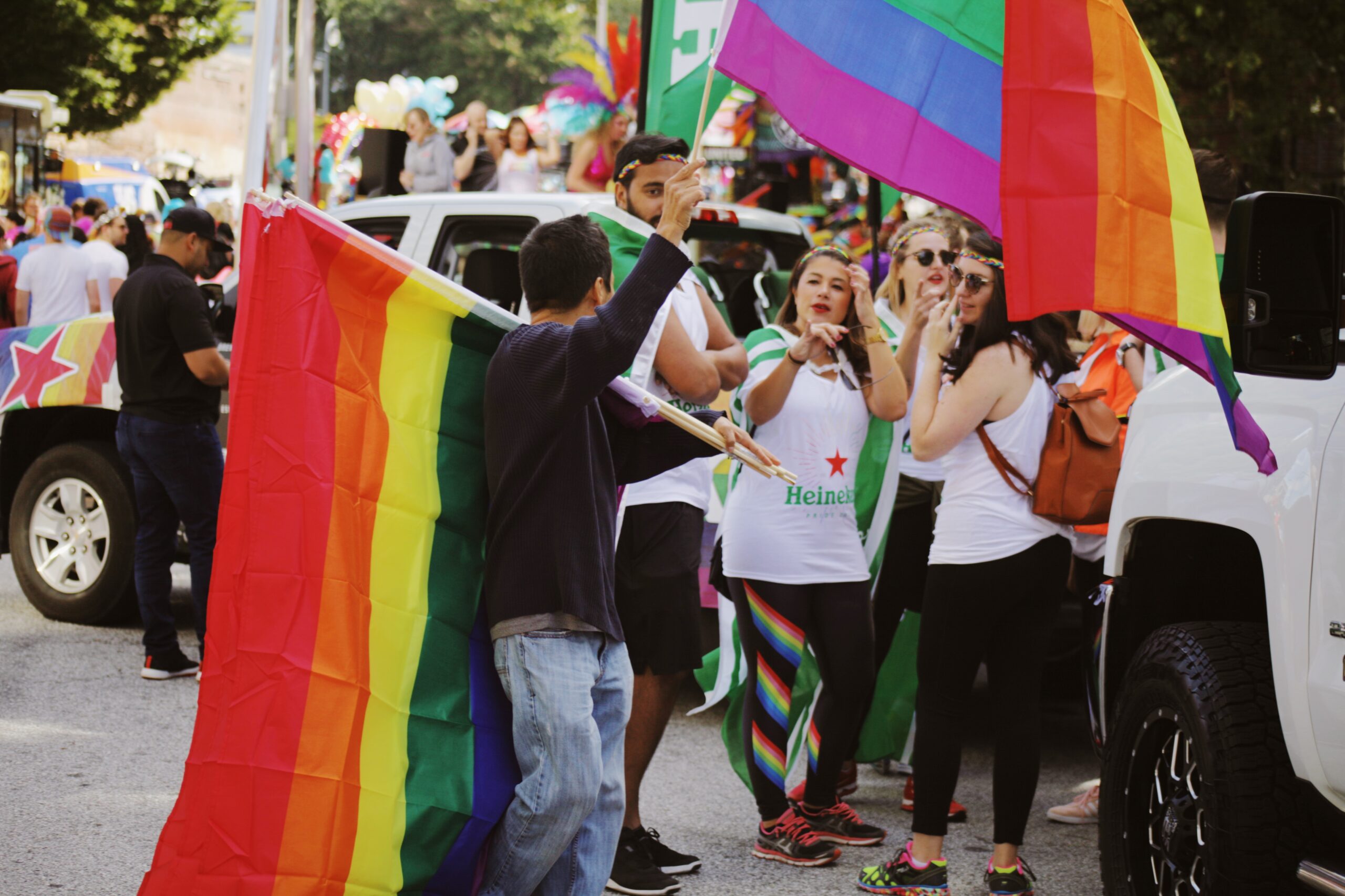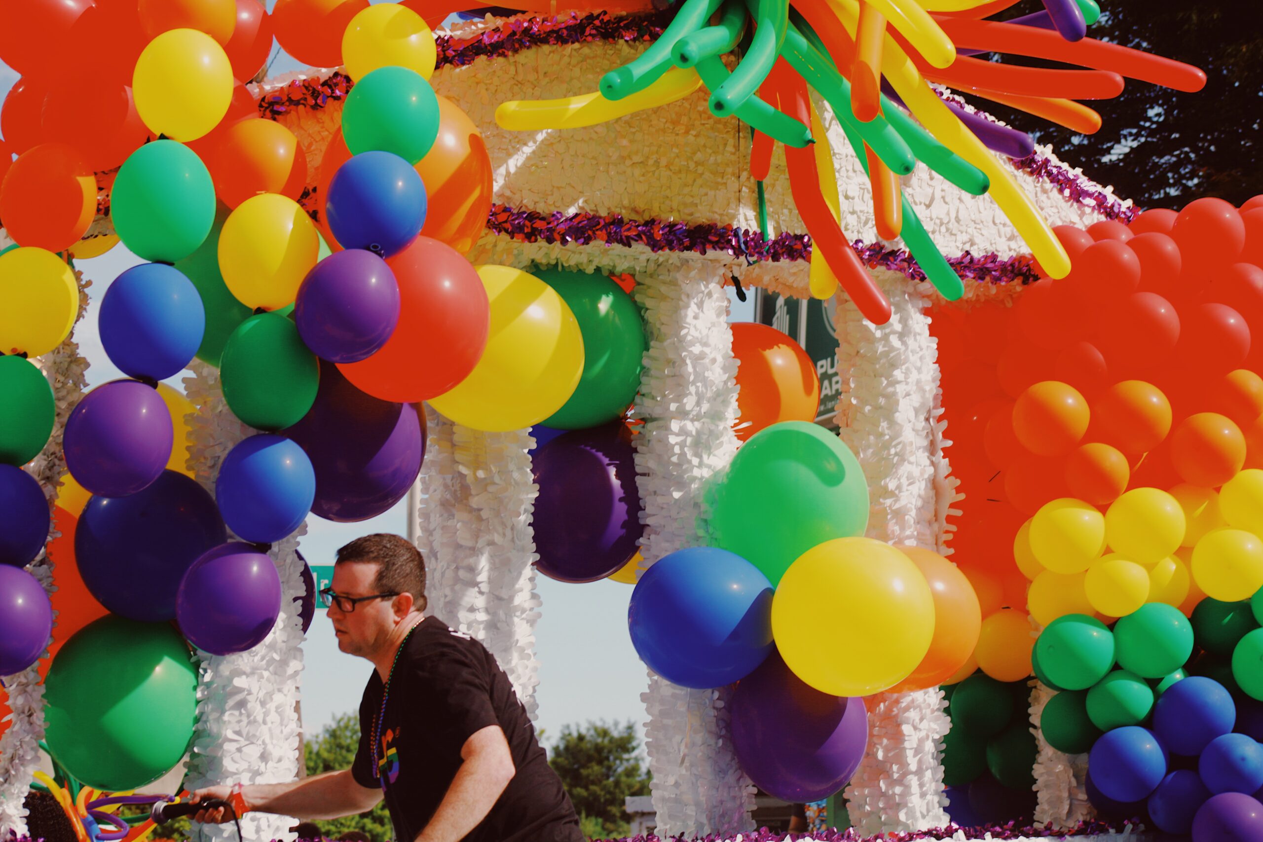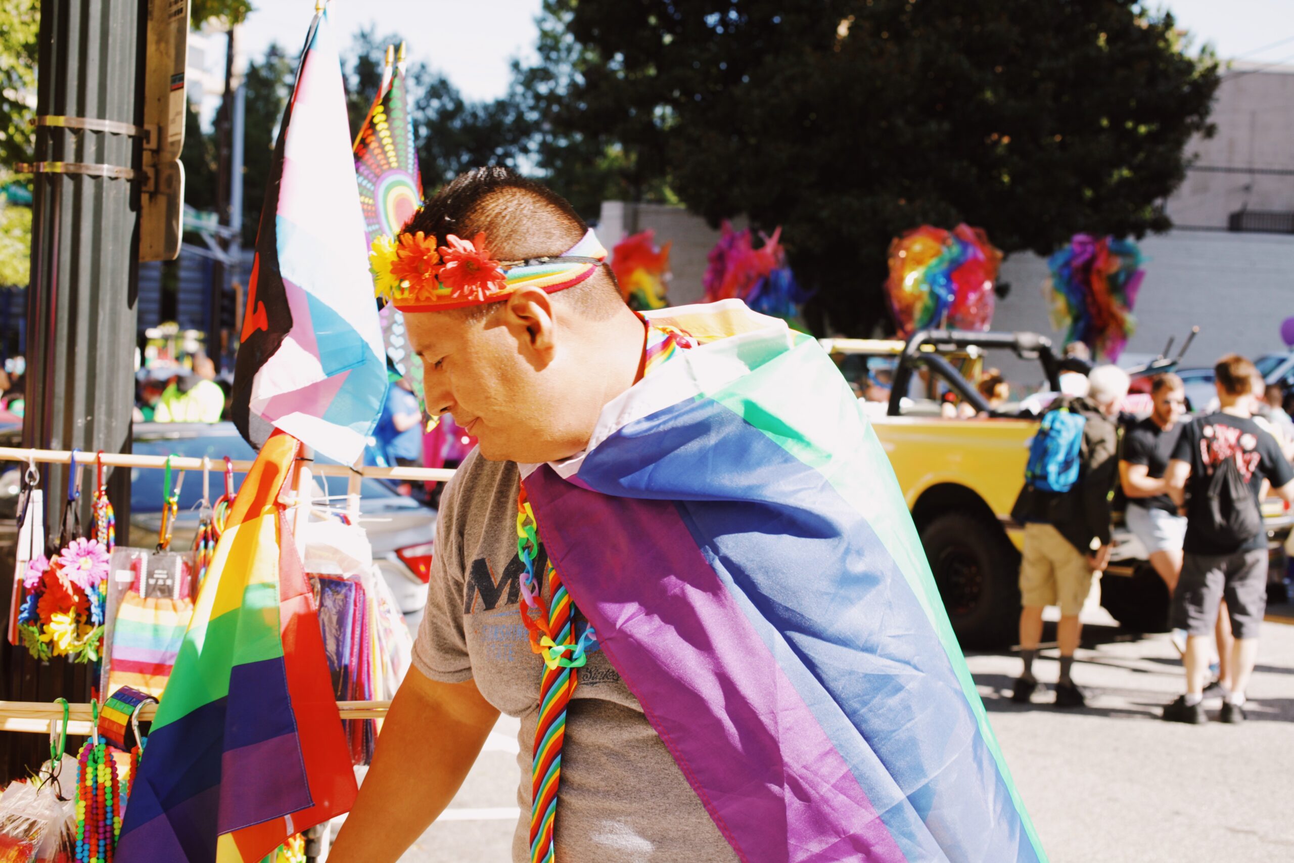 A cacophony of music and laughter wove itself into the environment of the parade, and vendors with carts full of vibrant PRIDE merch shouted into the streets waving various strings of beads and flags and t-shirts. People decked in PRIDE wear and rainbow flags grasped signage painted with a spectrum of colors in their hands, the empowering statements on them as vivid and impassioned as its hues.